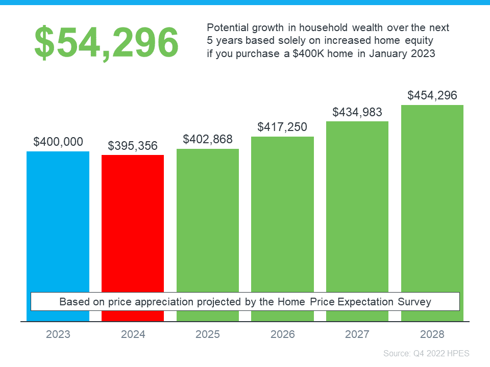 Experts consulted by the Home Price Expectation Survey (HPES) project that, while there may be a slight dip in house values this year, they will steadily increase over the next five years. If you are considering purchasing a home, it is important to understand that doing so now could give you a significant advantage in developing your net worth over time. With an average home price of $400,000, owning a house for five years could mean an increase of about $54,000 to your household wealth.