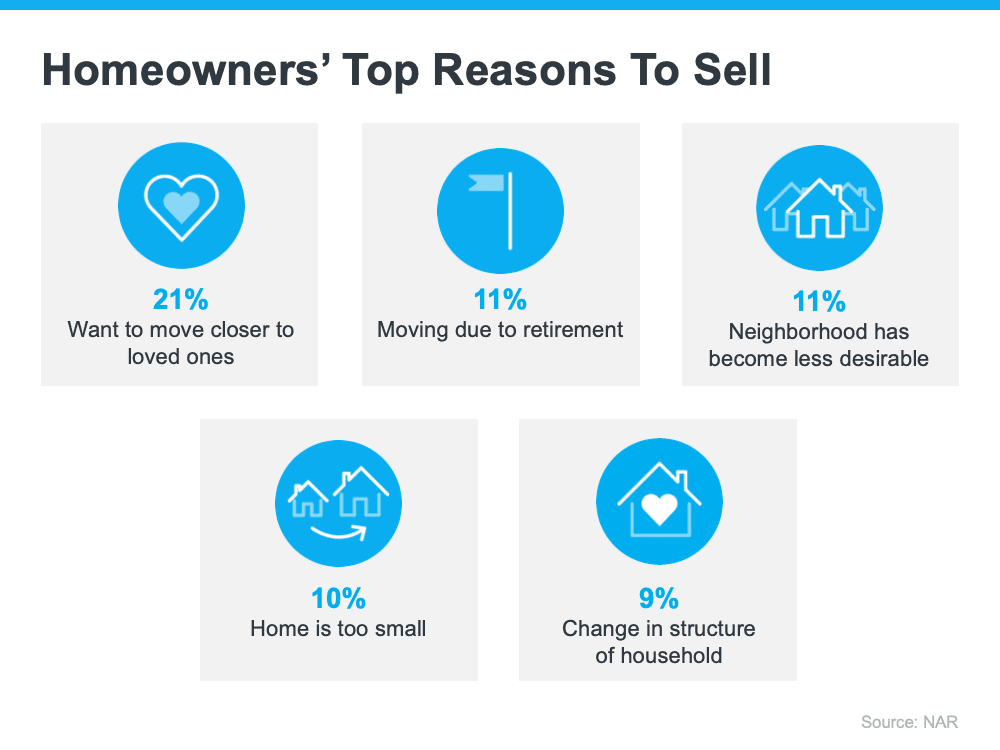 So, if you’re on the fence about selling your house, consider the other reasons homeowners are choosing to make a move. A recent report from the National Association of Realtors (NAR) breaks down why homeowners have decided to sell over the past year:As the visual shows, the most commonly cited reasons for selling were the desire to move closer to loved ones, followed by moving due to retirement, and their neighborhood becoming less desirable. Additionally, the need for more space factored in, as did a change in household structure.