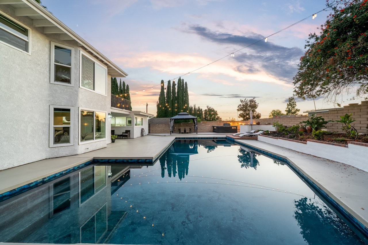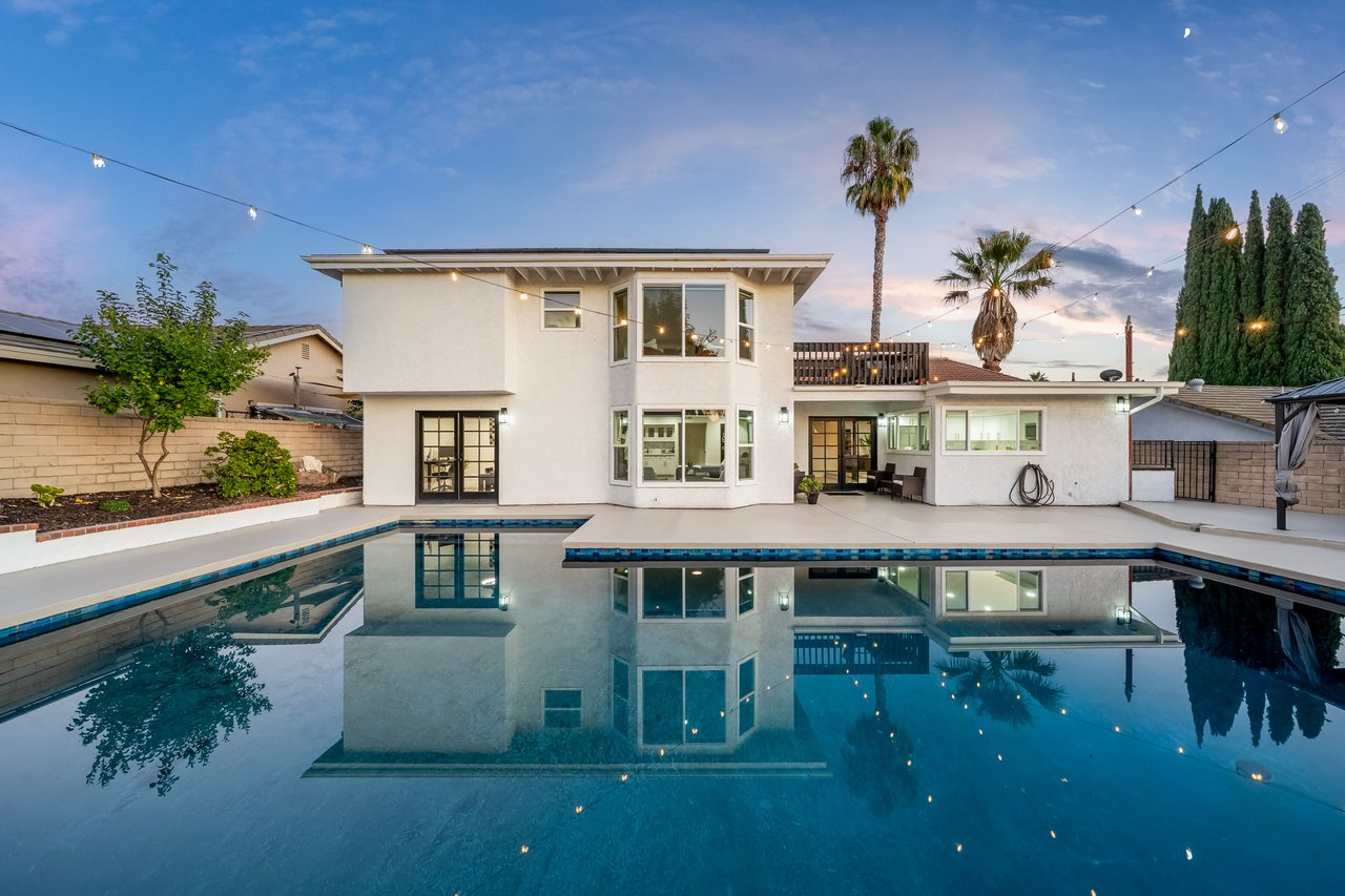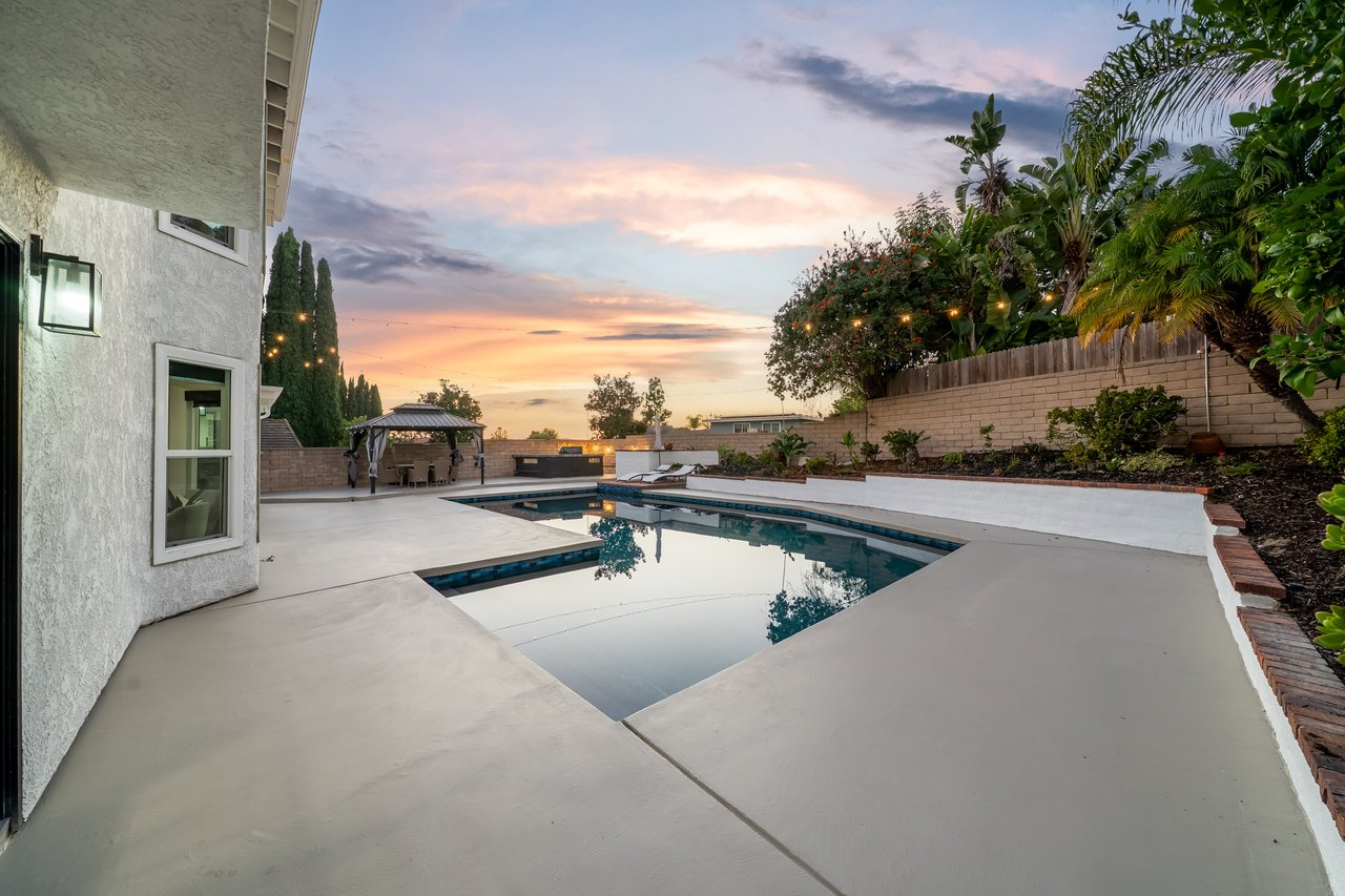 This beautifully updated home blends modern luxury with everyday comfort, featuring three private bedroom suites, each with its own remodeled bathroom complete with dual sinks and walk-in showers. One suite is conveniently located downstairs, while the primary suite upstairs offers a fireplace, walk-in closet, vanity, bay window overlooking the pool, French doors to a private balcony, and a luxurious bathroom with a freestanding tub and walk-in shower. Double doors open to a high-ceiling entry and a bright living room with a fireplace that flows seamlessly into the dining area. The kitchen has been fully updated with quartz countertops, a designer backsplash, and opens to a spacious family room with a wet bar and fireplace. Outside, the newly remodeled backyard has been completely transformed with fresh concrete, a sleek epoxy finish, and new BBQ countertops, creating an entertainer’s dream space beside the sparkling pool. Additional upgrades include a brand-new HVAC system upstairs and in the garage, fresh paint of coat on the walls, and epoxy flooring in the garage for a clean, polished look. With paid-off solar panels, no Mello Roos, and no HOA, this turnkey home is ready to impress!