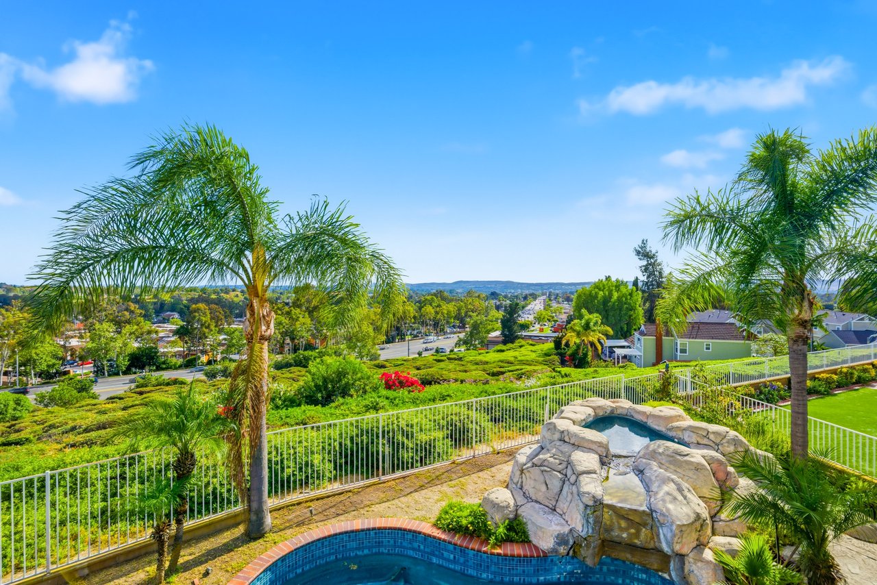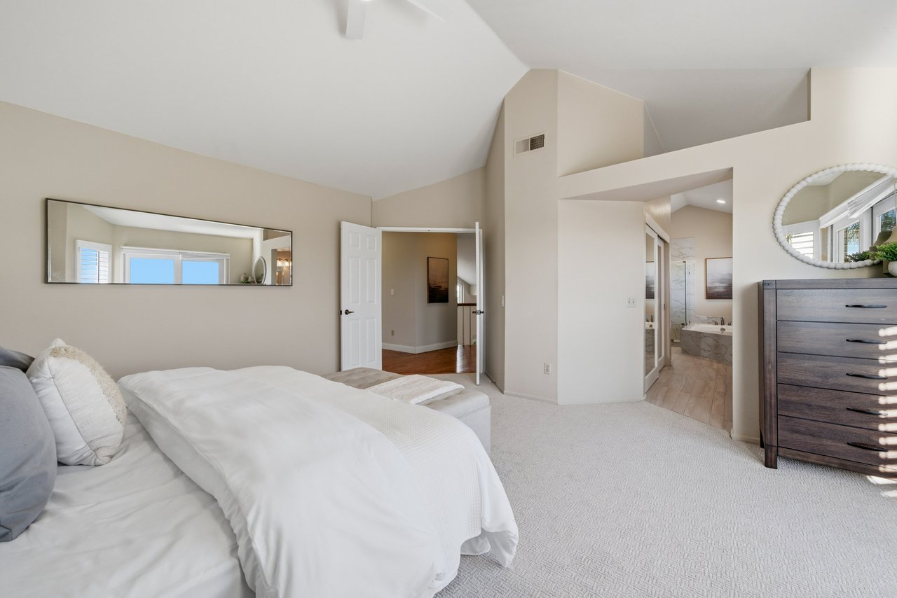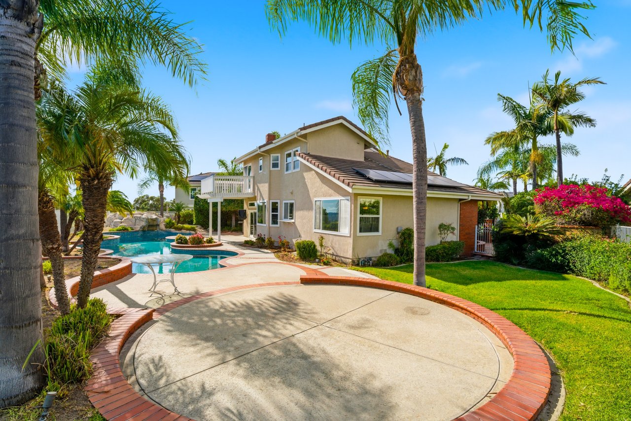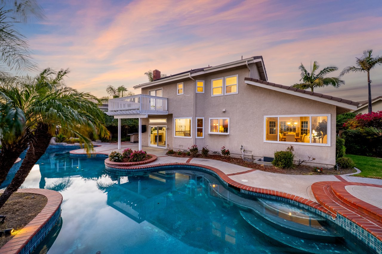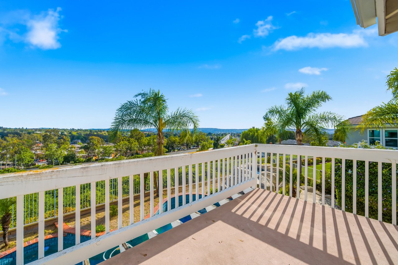 Welcome to your dream home at 25856 Windsong in Lake Forest, a truly one-of-a-kind two-story residence tucked away on a quiet cul-de-sac with breathtaking valley views, exceptional privacy, and abundant natural light throughout. This beautifully maintained home offers 4 bedrooms and 3 fully remodeled bathrooms across 2,246 square feet, situated on an expansive 8,800 square-foot pie-shaped lot. The bright and airy interior features vaulted ceilings, dual-pane windows and sliders, a formal living and dining area with bay windows, and a remodeled kitchen with a breakfast nook and outstanding views,seamlessly connecting to a separate family room with direct access to the backyard. The main level includes a downstairs bedroom, a three-quarter bathroom with walk-in shower, a dedicated laundry room with side-by-side washer and dryer, and generous garage storage. Upstairs, the primary suite impresses with vaulted ceilings, incredible light, a spacious bathroom with dual sinks, walk-in shower, separate soaking tub, and a large walk-in closet, along with two additional bedrooms and a remodeled hallway bathroom. The backyard is a private oasis featuring a large pool, spa/Jacuzzi, built-in barbecue area, and expansive grass space—perfect for entertaining or relaxing—while additional highlights include a whole house fan, solar panels to help keep energy costs down, a quiet setting away from the freeway, and a move-in-ready condition that is rarely found in a home offering this combination of views, lot size, and floor plan.
